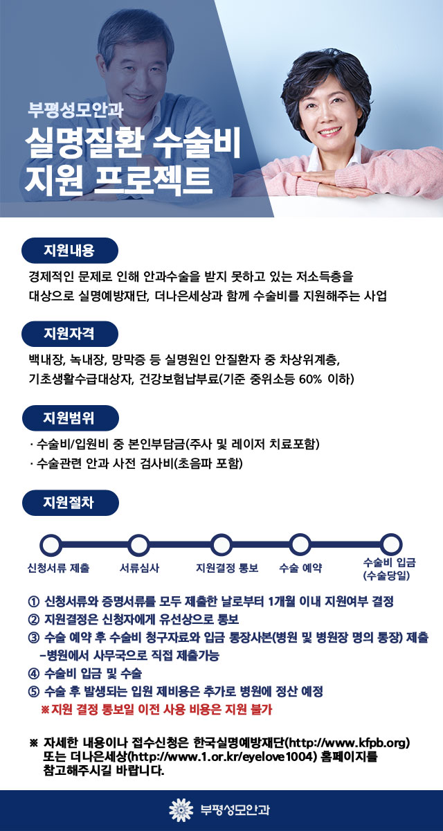 작성일17-06-07 00:00 [공지]저소득층 망막, 백내장, 녹내장, 수술비 지원 - 착한 나눔 프로젝트!