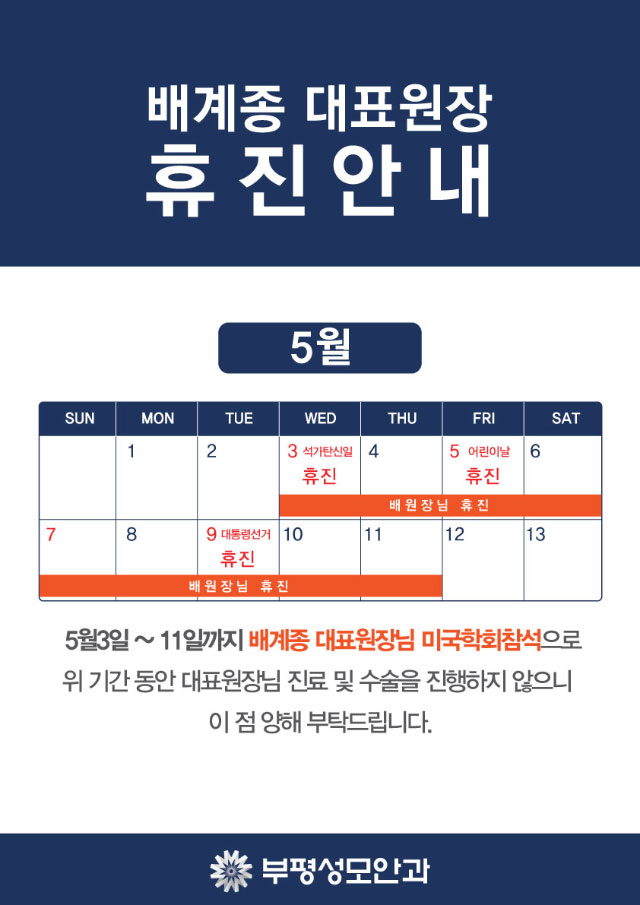 작성일17-04-24 00:00 [휴진안내]5월 배계종 대표원장님 휴진안내