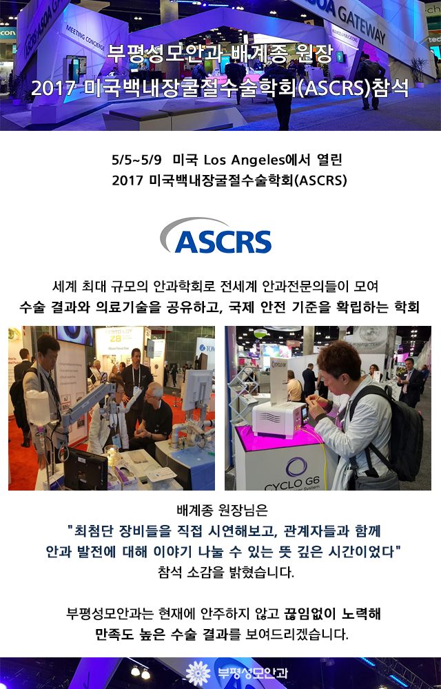 작성일17-05-18 00:00 [소식]2017 미국백내장굴절수술학회(ASCRS) 배계종대표원장님 참석