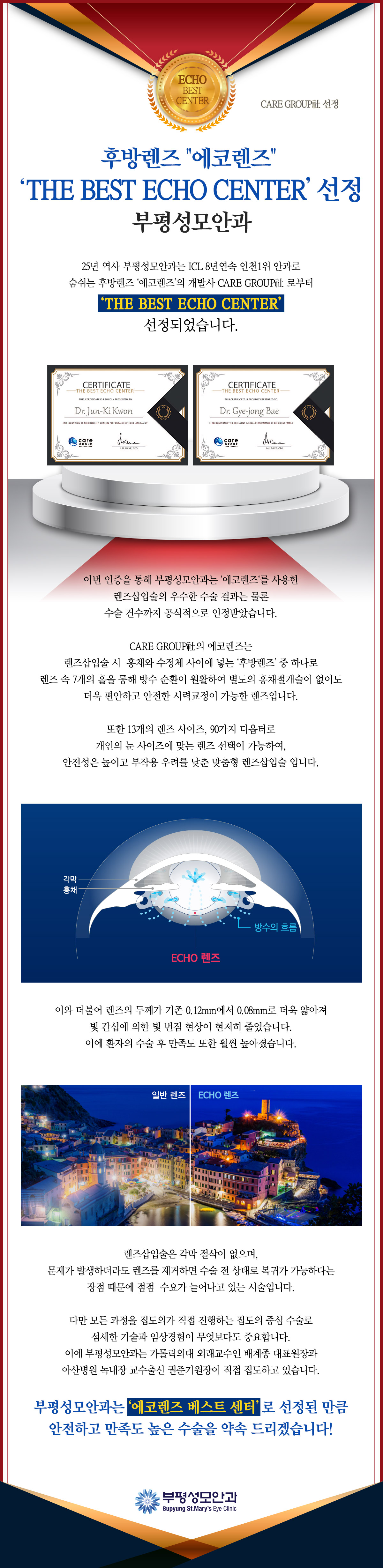 작성일20-09-23 00:00 [소식] 렌즈삽입술 후방렌즈 '에코렌즈'의 'THE BEST ECHO CENTER' 선정