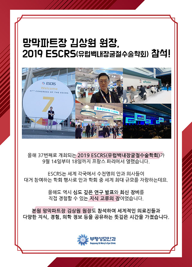 [소식] 망막파트장 김상원 원장, 2019 ESCRS(유럽백내장굴절수술학회) 참석! > 공지사항