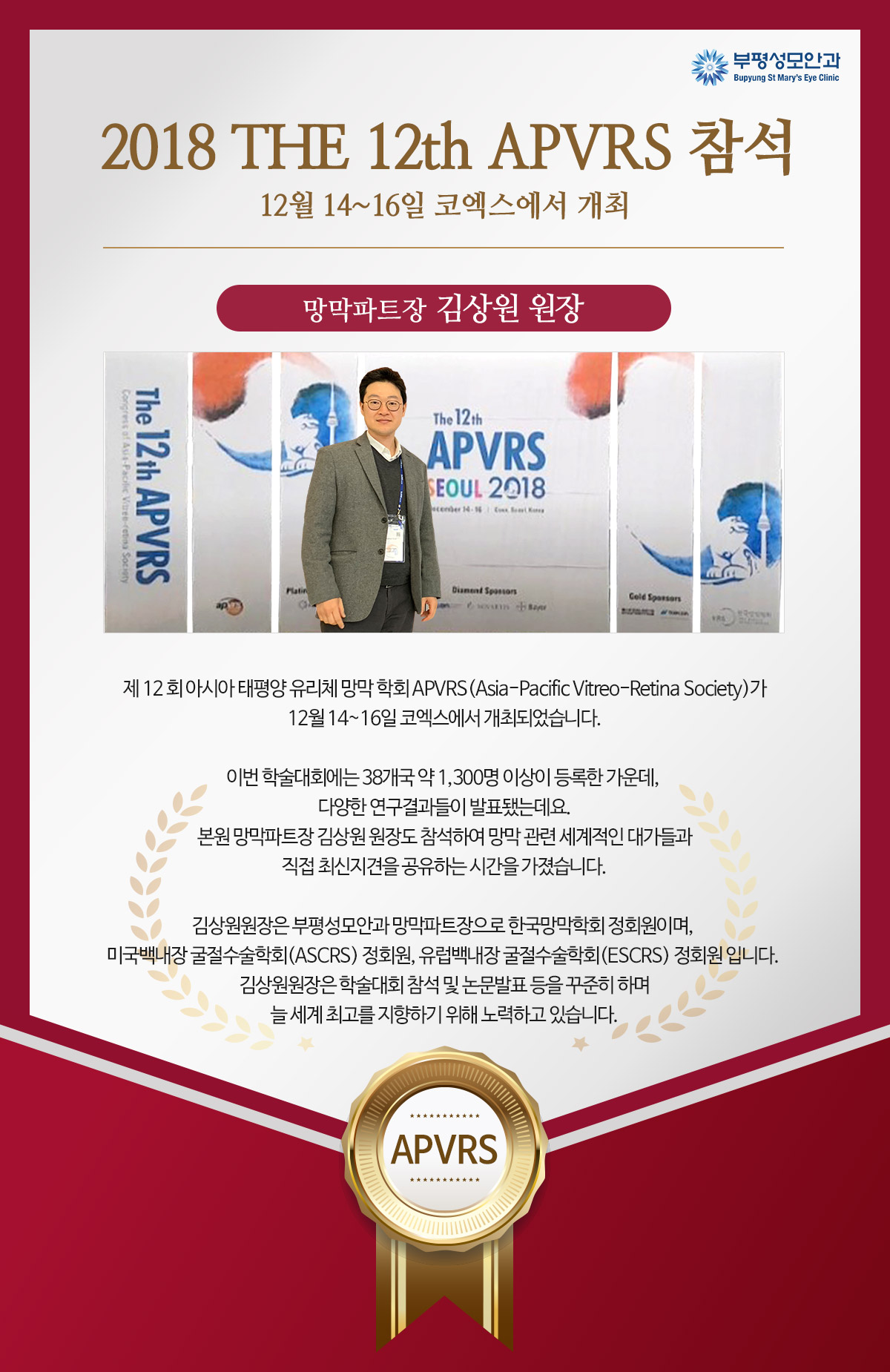 작성일19-04-15 00:00 [소식] 제12회 아시아 태평양 유리체 망막 학회 APVRS 망막파트장 김상원 원장 참석