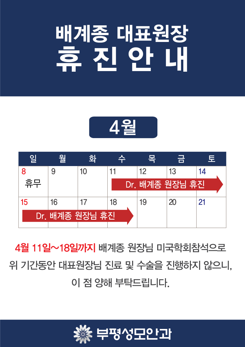 [휴진안내]4월 미국학회로 인한 배계종 대표원장님 휴진안내 > 공지사항