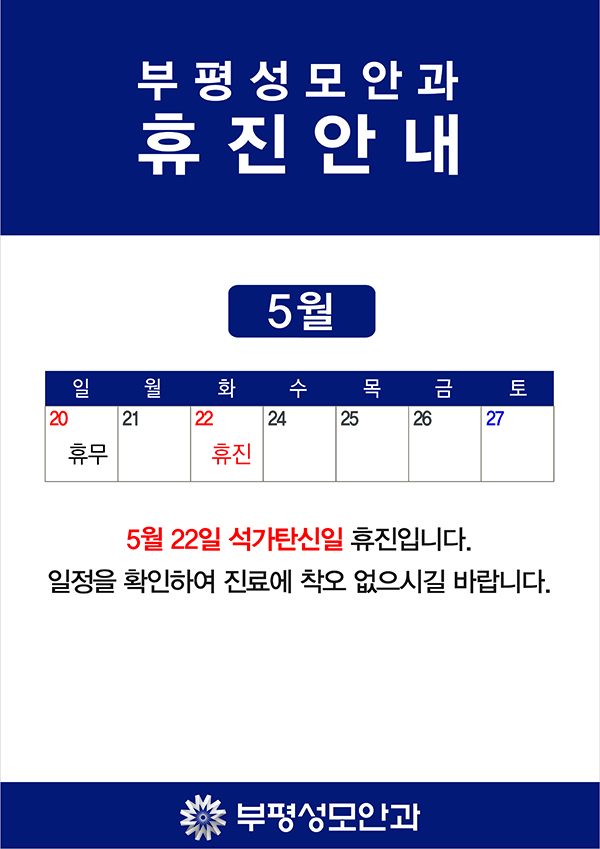 작성일18-05-10 00:00 [휴진안내] 5월 석가탄신일 휴진안내