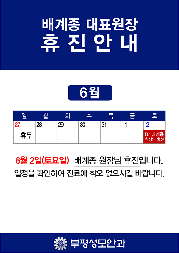 작성일18-05-10 00:00 [원장님 휴진안내] 6월 배계종 원장님 휴진 안내