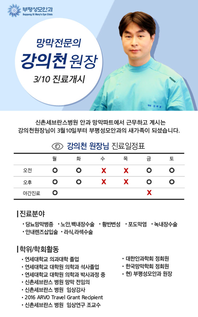 작성일17-03-09 00:00 [소식]망막전문의 강의천 원장님 초빙!