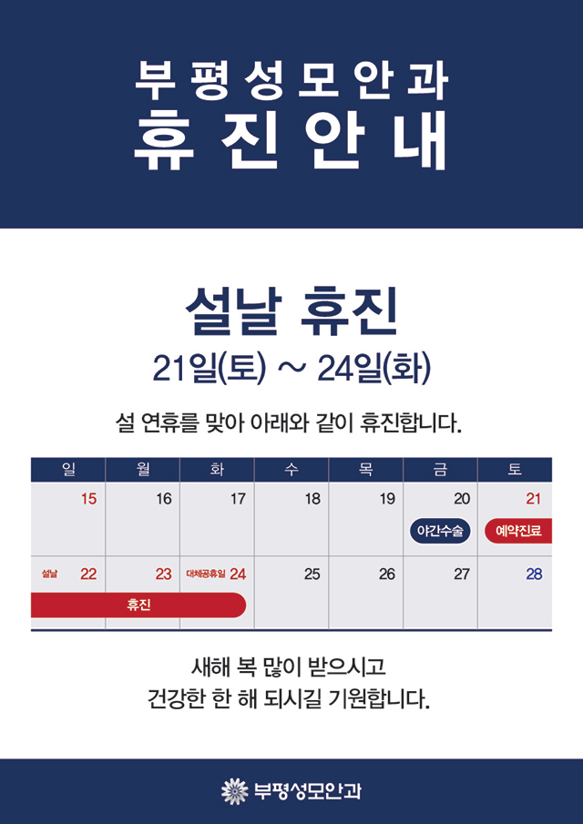 작성일23-01-09 00:00 [부평성모안과] 설날 휴진 안내