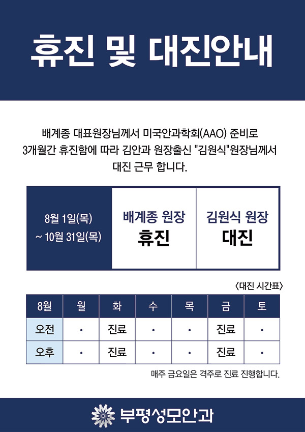 작성일19-08-05 00:00 [부평성모안과] 휴진 및 대진안내
