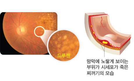 건성황반변성은 황반에 노폐물이 쌓이고 신경이 위축되는