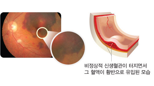 망막 밑에 생긴 신생혈관의 증식과 이로 인한 출혈이 망막을